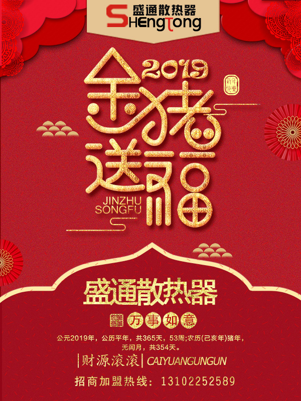 值此新年之際,盛通散熱器祝您:大財、小財、意外財,財源滾滾;親情、友情、愛情,情情如意;官運、財運、桃花運,運運亨通;愛人、親人、友人,人人平安,新春快樂哦!