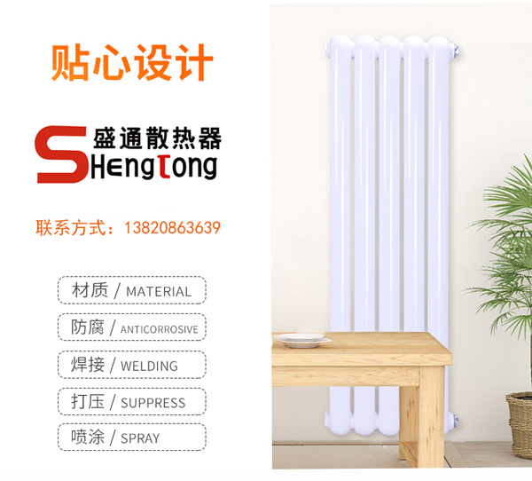 3.單戶供暖用戶,煤爐、電爐、燃氣爐:不宜采用粗管散熱器,粗管散熱器容水量大,反應慢,會浪費能源。 盛通散熱器是天津寧河一家新型采暖散熱器生產廠家,是天津散熱器生產基地的老品牌企業,產品主要有鋼制散熱器/銅鋁暖氣片/衛浴散熱器,面向全國批發散熱器,價格實惠,廠家直銷,天津散熱器品牌、哪家好,盡在盛通散熱器生產廠家。http://www.fsjxzl.cn